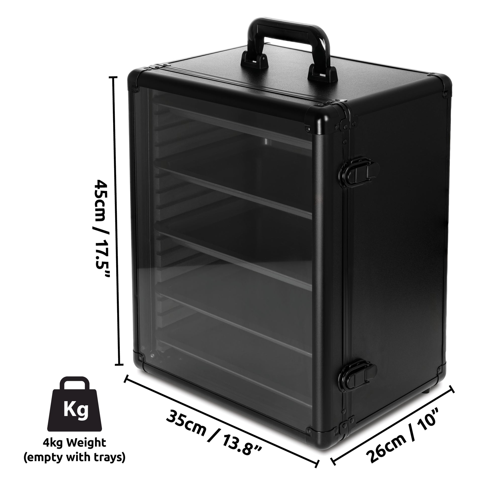 Protect, transport, and showcase your collection with confidence. This heavy-duty metal storage case features a reinforced aluminum frame, 6 adjustable metal trays, and a crystal-clear acrylic front panel — keeping your miniatures secure, dust-free, and beautifully displayed.