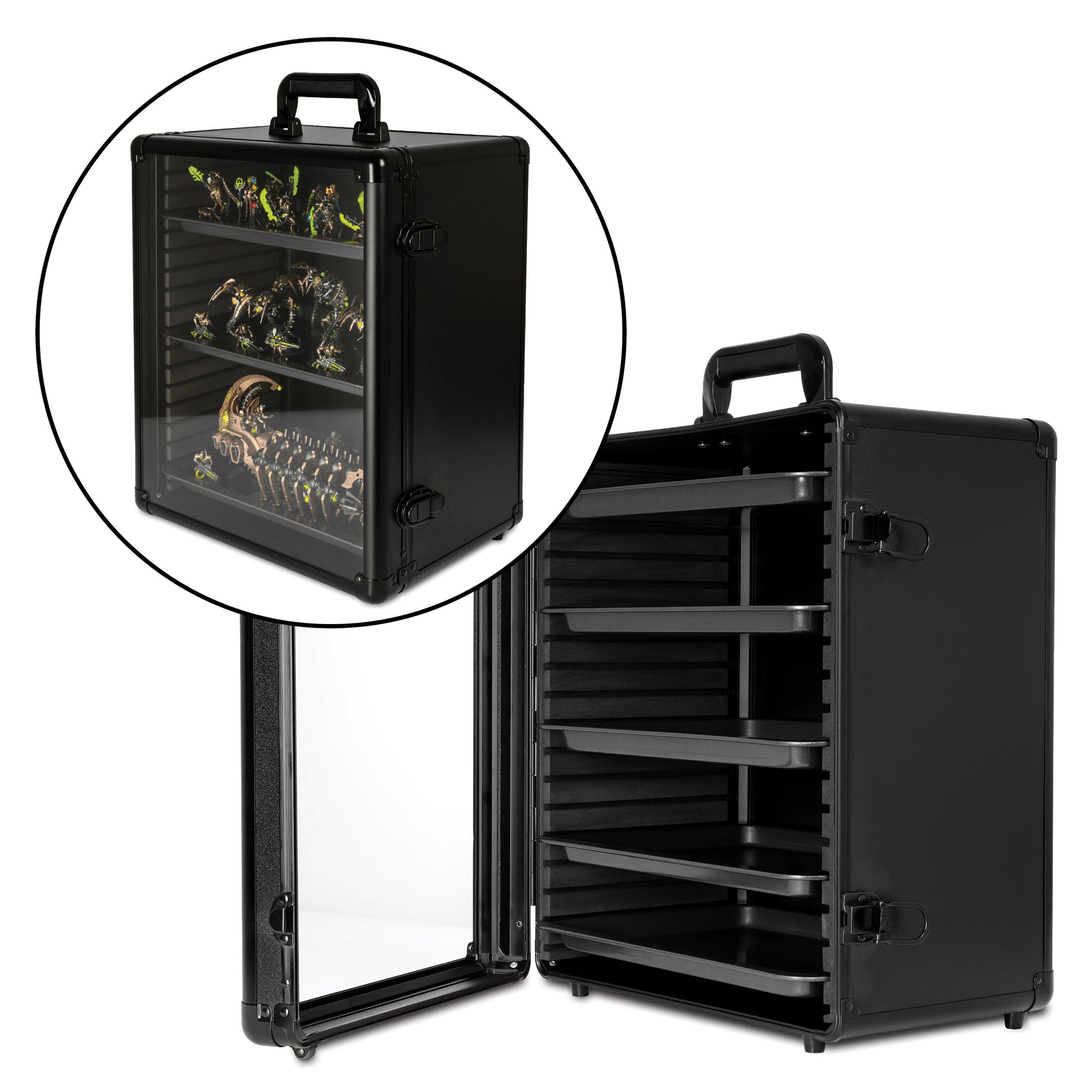 Designed for collectors and tabletop gamers, the smooth sliding trays accommodate different model sizes and work perfectly with magnetic bases for added stability during transport. Dual metal clip locks, a sturdy carry handle, and durable hinges ensure your collection stays safe wherever you go.